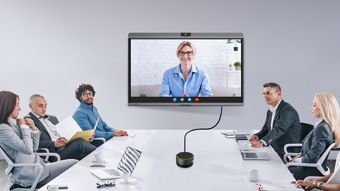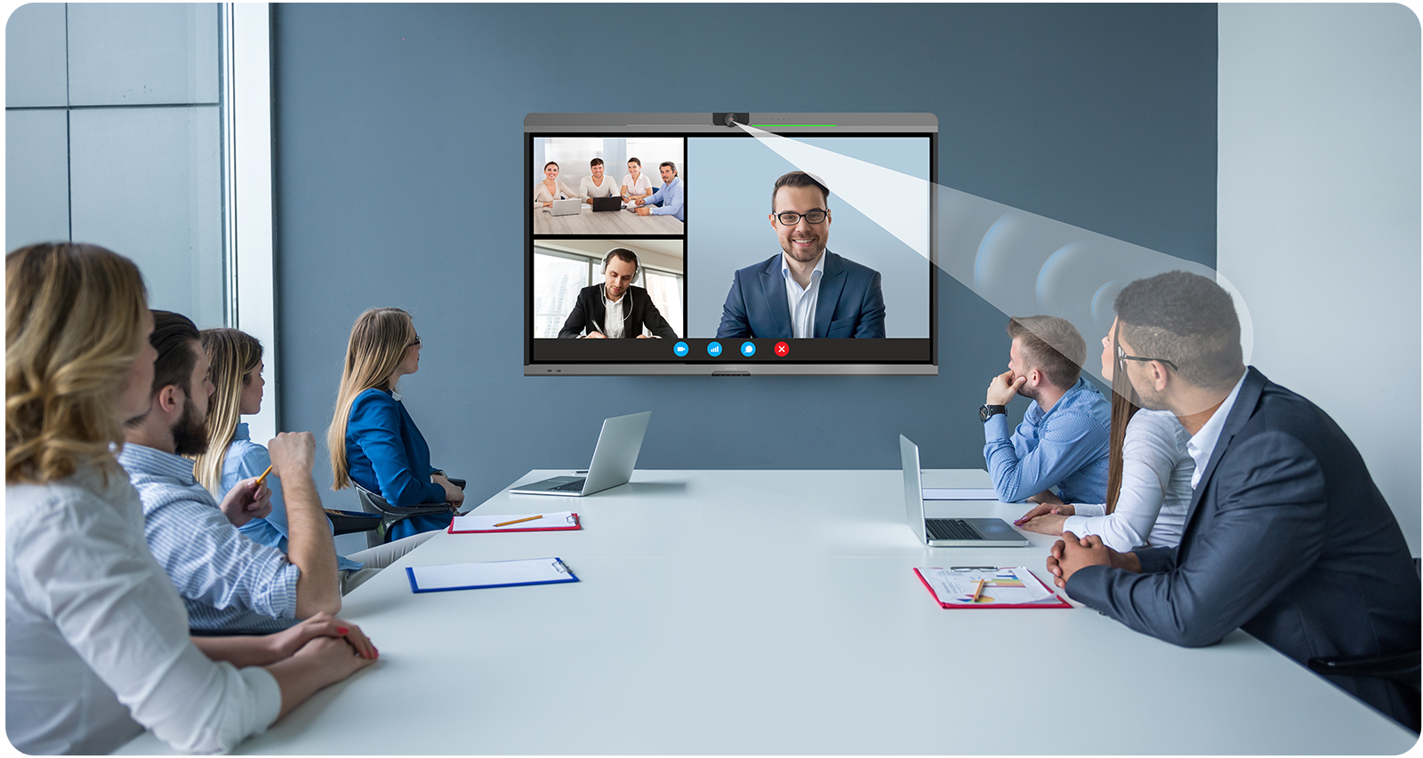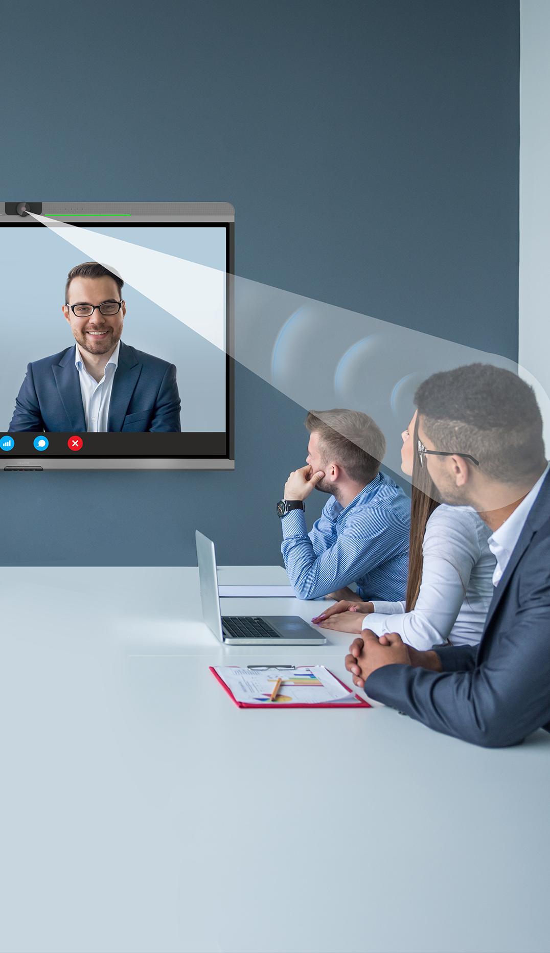 远程会议时,精准定位声源、自动增益,确保主讲人声音清晰,让发言人保持 C 位。内置可视化语音响应灯带,让会场发言状态一目了然。