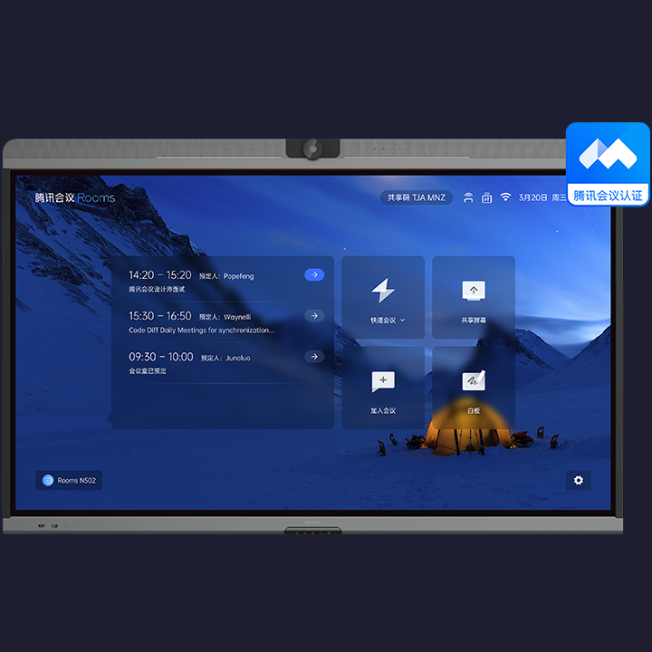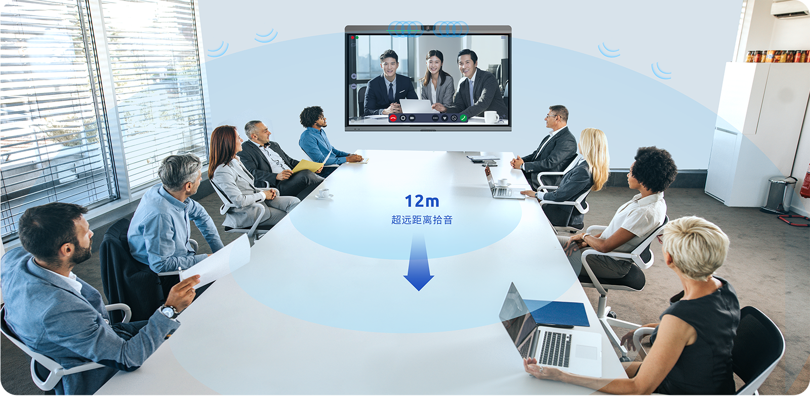 腾讯天籁inside语音模组,拥有180°广角及12米超远距高清拾音能力,无论与会者身处会议室哪个角落,都能确保清晰流畅的交谈体验;AI自动噪声消除、回声消除、波束形成等功能,可完美消除键盘、触屏、空调、风扇等超300种常见噪音,搭配人声增益控制,有效确保发言人即使在会议室的最远端,声音都清晰、真切,如面对面交流。