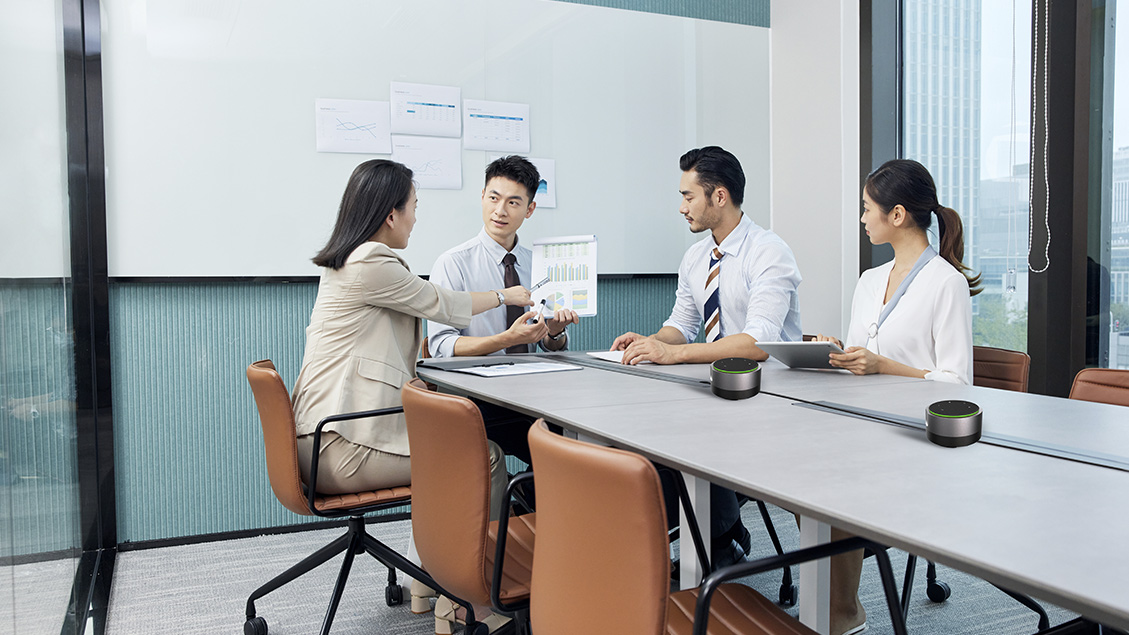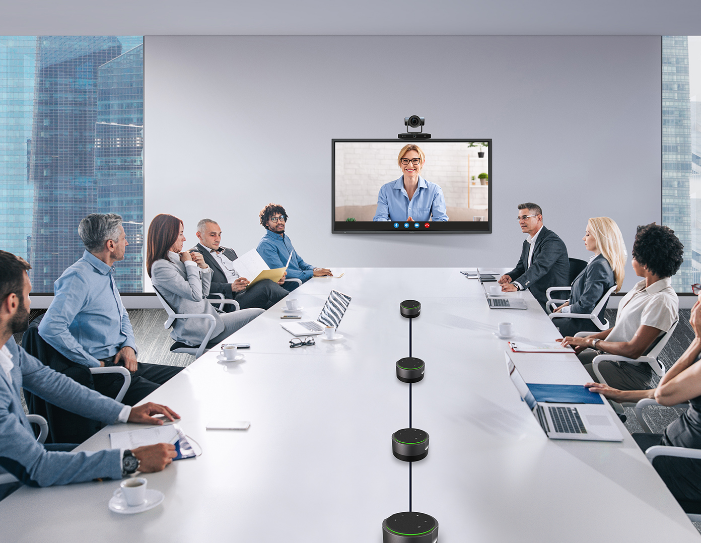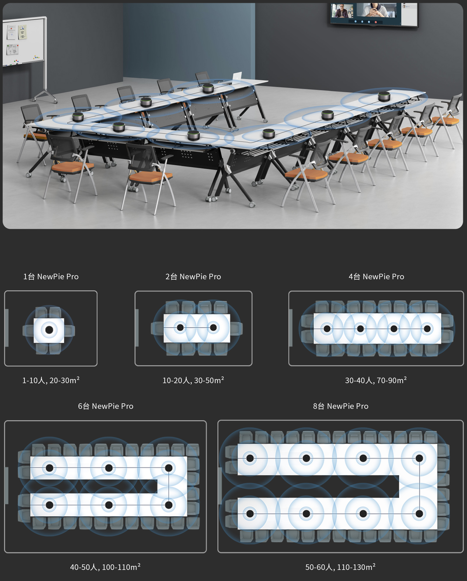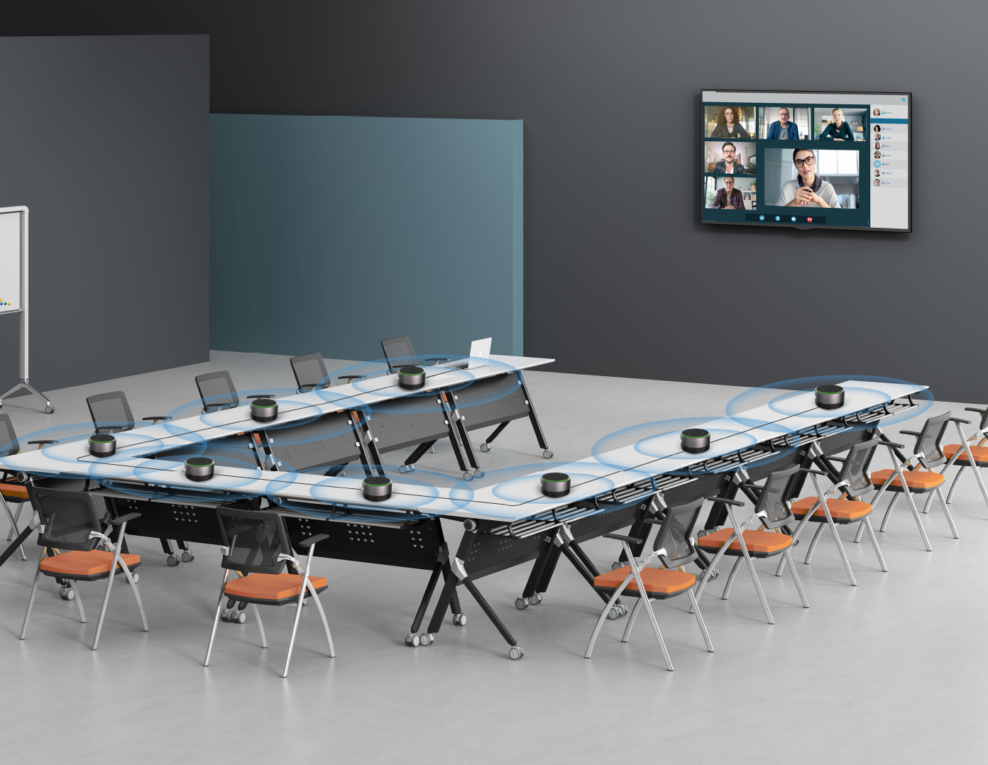内置高品质扬声器: 可实现通透双讲。采用高精度拾音与播放时钟同步,结合声源定位及麦克风阵列算法,实现多台级联的全空间覆盖式均匀拾音和播放。