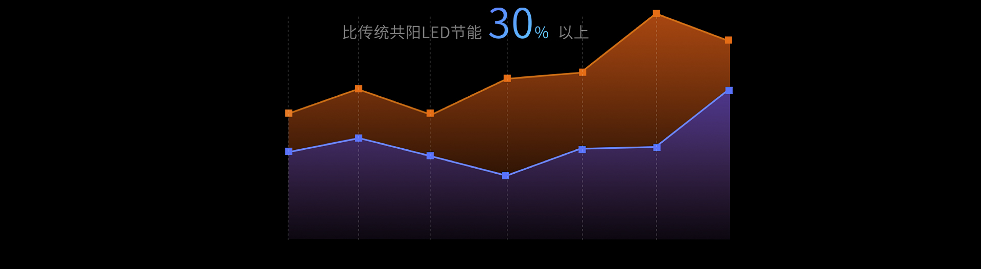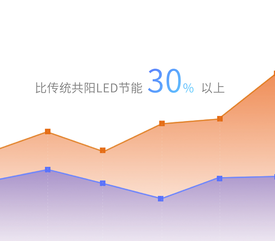全新低功耗驱动IC,降低能耗的同时将发光芯片光效发挥到最大,同等亮度及参数下,比传统共阳LED节能30%以上,实现近距离低温无感知。