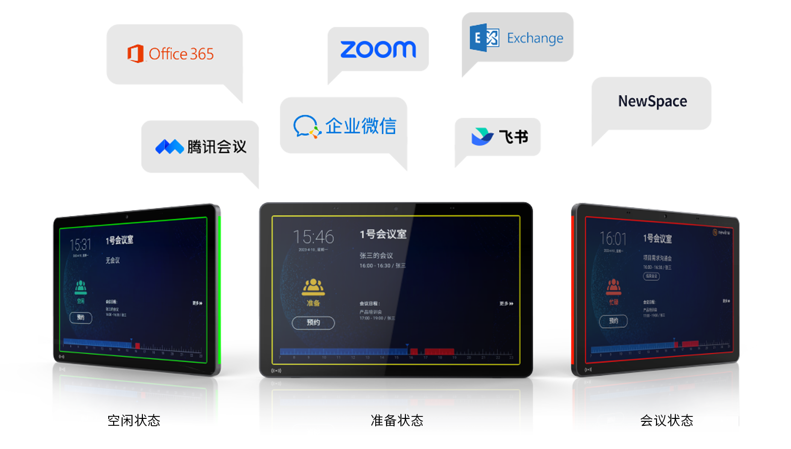 原生系统支持多种生态对接,支持企业微信、Exchange、Office365、NewSpace等多种生态对接。无需平台,即可实现微软 Echange或Office365的日程显示、企业微信原生日程预约会议,门牌自动同步会议信息和会议状态显示,配备IoT物联网传感器,感知空间状态,实现自动释放会议空间;原生的腾讯会议、飞书会议、Zoom 控制器体验使用,可轻松快捷地加入会议或控制会议,创造更好会议体验。