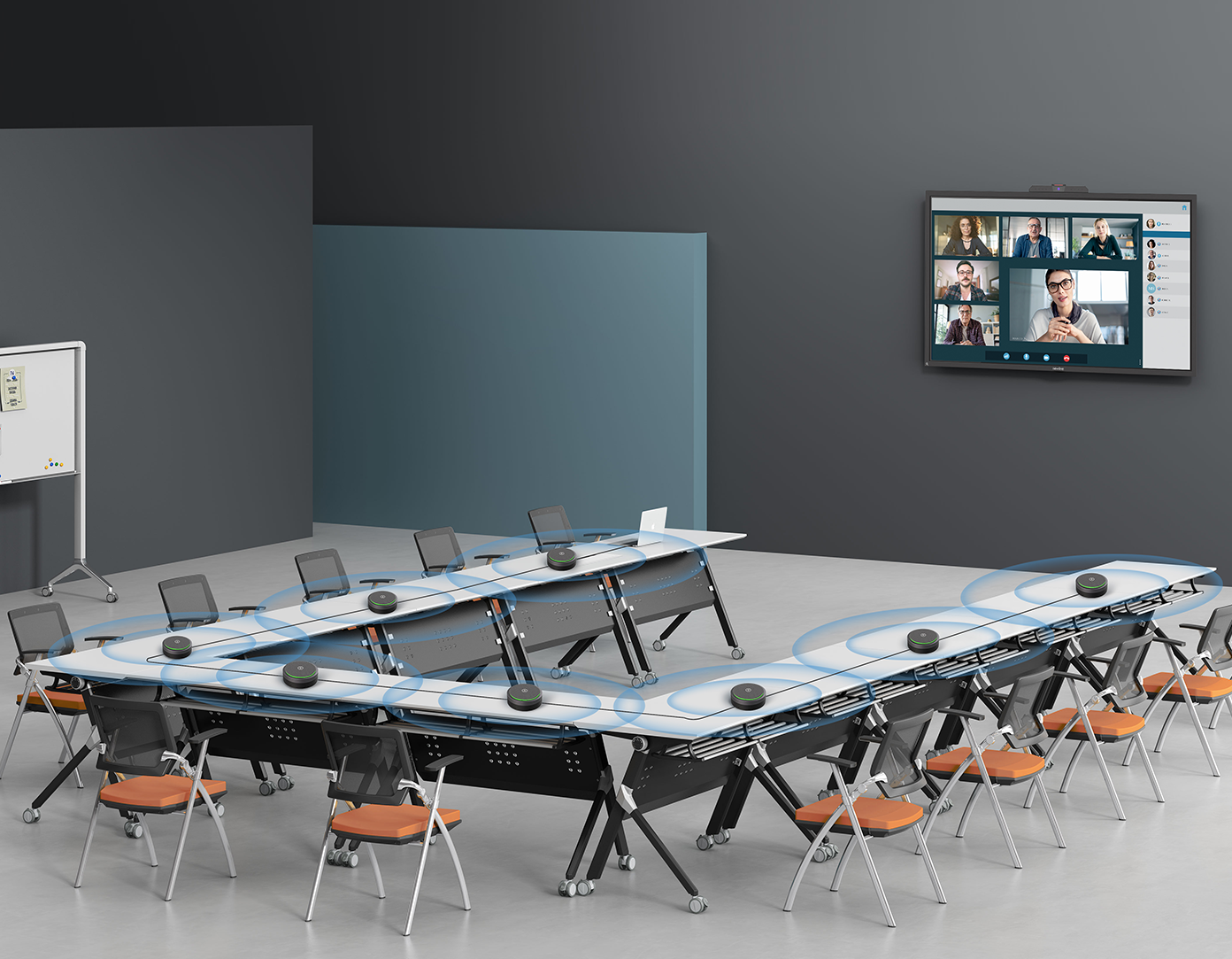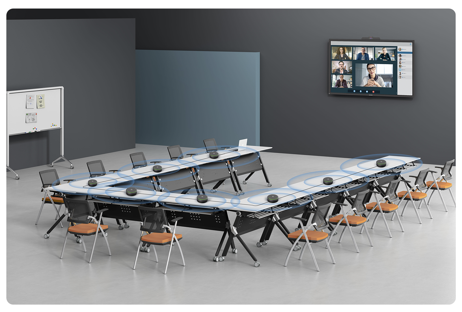 支持最多8台级联,采用高精度拾音声源定位及麦克风阵列算法,实现多台级联的全空间覆盖式均匀拾音和播放。